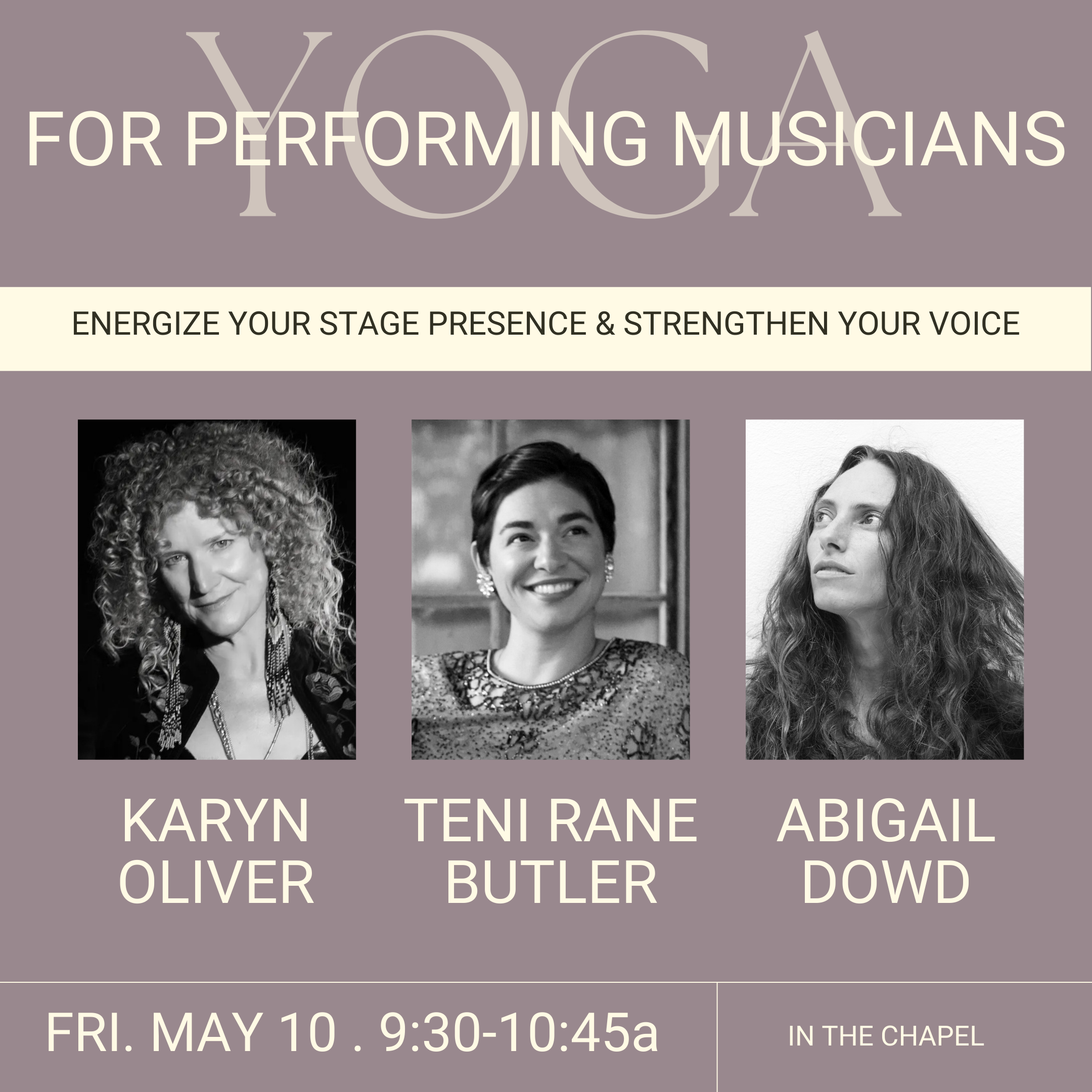 In this two part workshop, join Karyn, Abigail, and Teni as they take you through practices to strengthen your vocal presence and loosen up the body to support live performance readiness. This workshop incorporates gentle stretching, breath work, and body movement often found in yoga and tailored for musicians and singers. Previous yoga experience is not required for participation. In part one, the focus will be on daily routines - including simple yoga exercises, gentle stretching, meditations, and breath work - to release tension and strengthen vocal musculature. Part two will focus on practical modifications and tips and tricks for taking your practice on the road with you into limited spaces like all the "green rooms" traveling musicians visit. Wear loose comfortable clothing and bring a yoga mat or towel!